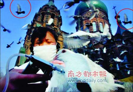 [提要] 現(xiàn)在是“大家來找碴”時間,06CCTV年度十大新聞圖片《藏羚羊生命中的十道難關——鐵路關》已被成功鑒定為假照片。今天推出的這張是2005年首屆華賽金獎作品《廣場鴿接種禽流感疫苗》。作者否認曾修改照片,但當年華賽評委蔣鐸認為兩只鴿子是PS無疑。接下來讓我們一起等待專家調(diào)查。