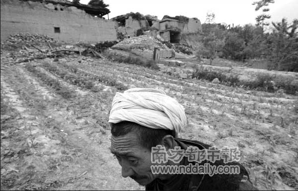 幸存的寨民都在寨子不遠的櫻桃林下用塑料布搭起帳篷,臨時棲身,226戶人家的寨子里,只有兩個人影在倒塌的房子里彎著腰翻找東西。纏著頭巾、穿著麻布衫的吳老太說:“鋪蓋都沒來得及拖出來,晚上住在帳篷里冷,想翻一翻看還能不能找得到”。
