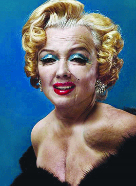 上世紀50年代的性感女神瑪麗蓮·夢露1962年去世時年僅36歲,如果她活到現在,將有82歲。她同樣也難逃“時間之斧”的摧殘。照片中的她皮膚松弛,滿臉皺紋。不過,或許由于曾施行了整容手術,在涂抹了濃厚的唇膏和藍色眼影之后,夢露的微笑依然能找到當年性感痕跡。然而,由于老年夢露身體已經明顯皺縮,她身上那件時髦的緊身低胸禮服顯然已不合尺寸,仿佛隨時都有掉下來的可能。