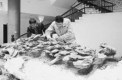 去年9月1日,東陽市文物管理辦公室接到群眾反映,城區(qū)一居民在“胡公山”發(fā)現(xiàn)幾節(jié)裸露的紅褐色骨頭,文物辦工作人員赴現(xiàn)場察看,初步確認為恐龍化石。9月2日,省自然博物館金幸生副館長等5位專家,確認在土層中裸露的三節(jié)紅褐色“骨頭”為恐龍椎骨化石。經(jīng)20多天的搶救性清理發(fā)掘,9月26日上午,恐龍骨架化石成功挖掘后安全搬入東陽市博物館。據(jù)悉,此次發(fā)現(xiàn)的恐龍骨骼化石包括10個背椎、6個薦椎、2個前部尾椎和腰帶部分,化石呈自然狀態(tài)連接。除了神經(jīng)棘缺失、左腸骨前突錯位外,其他部分均保存完整,是我國整體出土最完整的恐龍骨骼化石。