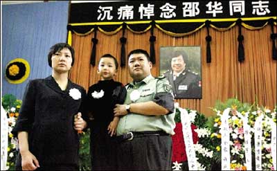 昨天,在通往靈堂的走廊里,邵華將軍生前創作的幾十幅攝影作品靜靜陳列。每個從走廊經過的人都忍不住停下腳步。除邵華的作品外,題為“邵華將軍幸福的一家”的系列作品格外引人注目,作品中既有邵華、毛新宇一家人的合影,也有一家人的生活照。一位來自邵華家鄉湖南的親友從看到照片時就開始流淚,一直哭著進入靈堂。