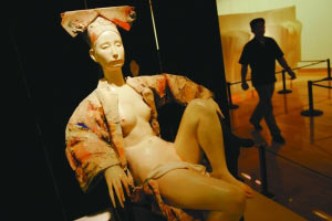 昨日,在第三屆中國北京國際美術雙年展上,一尊私處遮著白方巾的半裸慈禧雕塑,引起不少觀眾注意。雕塑作者李象群稱,該雕塑本無此“遮羞布”,是主辦方稱有觀眾舉報,才將雕塑私處遮蓋。