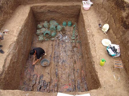 負責此次考古發掘的南陽市文物考古研究所專家柴中慶介紹,經文物鉆探發現,該片古墓葬有31座,年代大約為春秋晚期,其中大多數為土坑墓,1號墓和2號墓正在發掘清理。目前已出土銅鼎、銅缶、銅簠和青銅編鐘以及大量皮甲、金箔、銅飾件等珍貴文物。其中一號墓出土的銅鈕鐘、銅镈鐘、石編磬在南陽城區還是第一次發現;出土的5件銅鼎,其中兩件器形較大,直徑為50厘米,這是南陽城區發現的最大銅鼎。此次發現古墓葬之多,出土的銅鼎形狀之巨,古墓葬規格之高,在南陽市考古發掘史上尚屬首次。