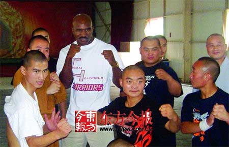 昨天上午9點(diǎn)半,曾經(jīng)4次戴上拳王金腰帶、在與泰森比賽時(shí)被后者咬掉右邊耳朵的美國(guó)拳王霍利菲爾德慕名來(lái)到少林寺,不僅一睹少林真功夫,還向少林寺方丈討教了不少練功的方法。