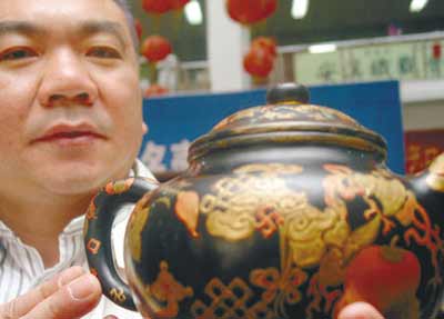 在當天沈陽茶城主辦的紫砂名壺拍賣會上,一把乾隆年間宮內(nèi)御用的“宜興窯紫砂黑漆描金吉慶有余壺”以155萬元的天價拍賣成功,這個成交價格也打破了此前香港佳士得拍賣行拍賣一件清乾隆剔紅饕餮夔龍紋紫砂壺時147.7萬港元的歷史最高價紀錄。