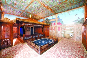 上午,記者在修復(fù)完工的倦勤齋內(nèi)看到:倦勤齋共面闊9間,以木裝修隔成了上下兩層的凹字形仙樓。最巧妙的是,齋內(nèi)各房間之間均以隔扇、檻窗、落地罩、炕罩等隔成相對(duì)獨(dú)立的空間。齋內(nèi)用歐洲透視方法繪出的絹面通景畫(huà)覆蓋了整個(gè)房間,據(jù)介紹整個(gè)倦勤齋有70余張畫(huà),其中頂棚處有12張,全部約170平方米,如此大量反映18世紀(jì)歐洲美學(xué)對(duì)中國(guó)裝飾藝術(shù)影響的通景畫(huà),不僅在紫禁城而且在全中國(guó)也是絕無(wú)僅有的。當(dāng)年乾隆皇帝觀戲的小戲臺(tái)被裝飾得古色古香,戲臺(tái)上方的天花板上全部都是枝藤茂密的紫羅蘭圖案通景畫(huà),房間的墻壁上則細(xì)膩地描繪了紫禁城里的建筑和山石景色。而在以仙樓圍成的中廳內(nèi),精美的竹絲鑲嵌、玉雕和木雕藝術(shù)同樣令人嘆為觀止。