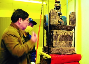在此前的準備工作中,用來固定、提取寶塔的1號、2號機械手以及布帶已經安裝就緒,寶塔整體也被紅綢布從底部兜住。昨天下午3時,隨著工作人員操作手拉葫蘆,寶塔從鐵函內緩緩升起。為了保證寶塔垂直平穩地上升,避免傾斜或與鐵函內壁進行碰擦,提吊過程十分緩慢。隨著寶塔的升起,塔剎部分露出函口,通過電視轉播畫面,能清楚地看到蕉葉上裝飾有坐佛、臥佛等精美圖案。遺憾的是,塔剎下部的兩個相輪出現了破損。