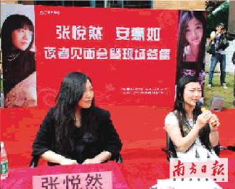 22日中午,“80后”作家張悅?cè)粩y同安意如帶著她們的作品《鯉:嫉妒》以及《惜春紀(jì)》來到廣州大學(xué)城進(jìn)行讀者見面會暨作品簽售。“美女作家”的頭銜吸引了不少廣東大學(xué)生,當(dāng)天中午,簽售會現(xiàn)場火爆,使得原計(jì)劃12點(diǎn)半結(jié)束的簽售會延遲到了1點(diǎn)半。簽售會結(jié)束后,張悅?cè)慌c安意如接受了本報(bào)記者的采訪。