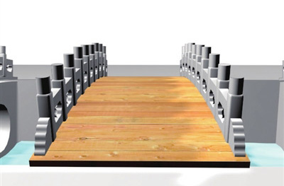 橋上架設棧道 棧道將滿鋪木板,能夠承受游人活動等所產生的荷載強度等。棧道與橋面支撐處將采取彈性相接,并選擇橋面范圍以外的地方進行固定。