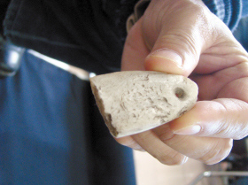 文物中有一個非常漂亮的魚形石刀殘片——一個長五厘米左右的石制“魚頭”,魚頭上刻著魚眼和魚鱗,很精美。趙殿坤說,這是當時用的切割工具。由于它比較小,所以做得精致,很有文物價值。