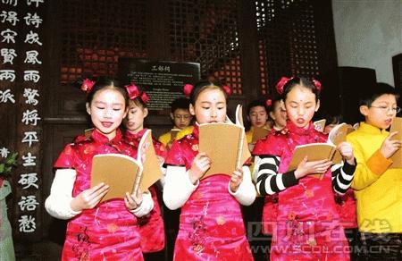 昨日的草堂高朋滿座,著名學者、詩人鐘樹梁、流沙河、張志烈等文人雅士,杜甫草堂詩書畫院的藝術家及省內文博單位代表悉數到場,近萬成都市民和外地游客也在祭拜活動開始前涌入草堂。10時整,兩扇朱門開啟,一面印有“草堂人日”字樣的幡旗于門前緩緩升起,人們屏住呼吸,現場異常安靜。一陣稚嫩童聲傳來,眾人細聽,得悉孩童們念誦的正是憂國憂民憂天下的杜甫所作傳世詩歌:“安得廣廈千萬間,大庇天下寒士俱歡顏,風雨不動安如山!”、“國破山河在,城春草木深”、“兩個黃鸝鳴翠柳,一行白鷺上青天”……一邊應和的是古琴大師們演奏的悠揚古琴,詩圣杜甫心中的那份蒼涼詩情,瞬時穿越千年時光,直達眾人心中。一杯薄酒,一束臘梅,現場市民游客逐一上前向詩圣像鞠躬行禮,表達對杜甫的敬意。
