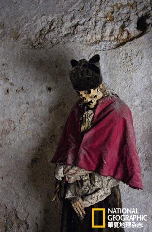 美麗小鎮(zhèn)諾瓦拉有一座規(guī)模宏大、富麗堂皇的教堂。祭壇前方有一扇通向地下密室的暗門(mén),只需撳動(dòng)一個(gè)隱藏的按鈕,電控開(kāi)關(guān)就會(huì)把門(mén)打開(kāi),如同007電影中的情景。下了臺(tái)階就能看到一列壁龕,存放著衰敗程度各不相同的主教尸體。他們坐著鑿了些圓孔的小石椅(供體液滲流),面容僵直,像是在一起享受公廁里的放松時(shí)刻。一座擺滿(mǎn)了頭骨的高架子上有個(gè)盒子,里面裝著兩具自然干化的貓尸,恍若古埃及的魅影。它們困在這地下墓室里,提醒著人們:即使真有九條命,歸宿也只有一種。 (來(lái)源:《華夏地理》雜志 )