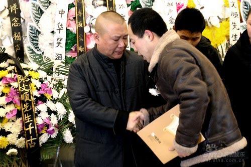 上午7點44分,德云社內(nèi)部的吊唁活動率先進(jìn)行。郭德綱、王惠夫婦,于謙、王海、李菁、何云偉、曹云金等骨干演員率百名演職人員向張文順先生的遺體默哀,禮畢后人人號啕大哭,痛不欲生。雙眼紅腫、哽咽不斷的郭德綱嘆息說,張先生走得太早了,自己失去了一位摯友,他愿老人能夠在天享福,歡笑來生。郭德綱承諾會照顧張夫人,并用心培養(yǎng)張文順的外孫寧云祥在德云社說好相聲。