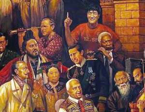 戴都都:我2006年春節過后和兩位朋友花了前后將近一年的時間畫了這幅畫,而構思多年前就有。1999年,我畫了一幅畫叫《中國故事》,也叫《老李頭兒的文物店》,利用“文物店”畫了幾百個中國文物,每個文物都講述了一個中國故事。這幅畫獲得了當年文化部藝術大獎的金獎。之后我想像講中國故事一樣講世界歷史,于是就想通過把對歷史起重要作用的偉大人物超時空地放在一起構成世界歷史。