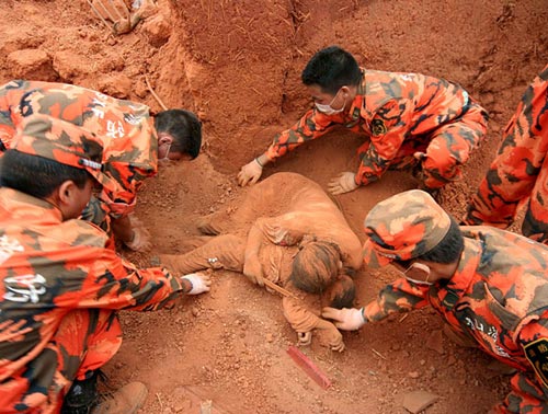 《地震中的母女》(母愛·地震) MOTHER LOVE IN EARTHQUAKE。2008年8月30日16時30分,四川攀枝花市、會理縣交界處發生6.1級地震,造成36人死亡,675人受傷。圖為消防官兵在倒塌的土墻下刨出兩名罹難者的遺體。 The photo taken on Aug. 31, 2008 shows firemen try to get o