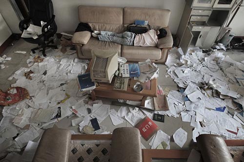 金融危機中的辦公室 Office in the Economic Crisis 。2008年10月14日,一位催討債務的男子在江龍集團銷售辦公室睡覺。受全球金融海嘯影響,國內最大的印染企業