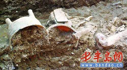 雖然這次沒有在墓葬中發現青銅鼎,但發現了簋、鬲、豆、罐等陶器,而且還發現了殉狗的骨骼及牛的部分骨骼。山東大學的王芬老師告訴記者,殉葬狗是當時的一種社會風俗。雖然當時處于奴隸制社會,但隨著文明的進步,已經用殉狗來代替殉人。此外,還發現了周代人用來存儲糧食的窖藏遺址和丟放垃圾的灰坑。根據此次的發掘結果,青島市文物保護考古研究所所長林玉海認為這是一個周代貴族的墓地。