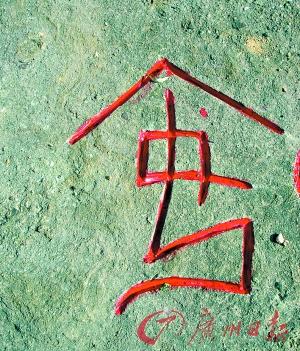 在這些甲骨文中最大的一個字有1平方米那么大,最小的一個字有20cm×30cm那么大,光一個“日”字就有九種寫法,“月”字也有六種寫法,有不少甲骨文字是象形的看起來很形象生動。荊鴻說:“我從去年6月份開始雕刻,花了4個月的時間才完成,現在想想覺得很有成就感。”這些甲骨文被雕刻完成之后,荊鴻和他的學生又把這些字刷成紅色,遠遠望去,這些甲骨文既有藝術感又富含文化底蘊。