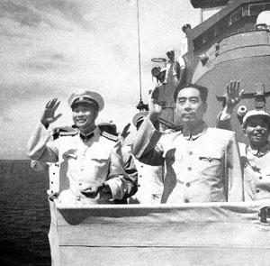 當(dāng)天,離閱兵還有一小時,青島海軍基地機關(guān)、學(xué)校、部隊組成的軍官隊伍已經(jīng)整整齊齊地排列在碼頭上。東海艦隊司令員陶勇率領(lǐng)的我國自行裝配的護(hù)衛(wèi)艦“昆明”號和另一艘軍艦也由上海趕到青島,接受總理的檢閱。9時許,周總理一行在肖勁光的陪同下來到了碼頭。
