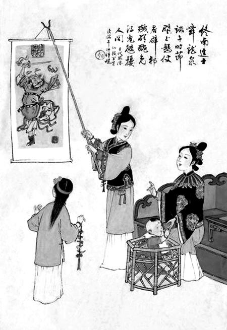 端午節期間,有些地方還流行居室中懸掛鐘馗像的習俗,據清代《北平風俗類征》記載:“五月初一至初五為端陽節,午時以朱墨畫鐘馗像,用雞血點眼,俗稱‘朱砂判’者懸屋中,謂能驅邪。”顧祿曾在他的《清嘉錄》中也有記述:“適逢端午,堂中掛鐘馗畫圖一月,以祛邪魅。”鐘馗乃唐朝有名畫家吳道子筆下的人物。據宋代《醉翁談錄》云:“除夜,舊傳唐明皇是夕夢鬼物,名曰鐘馗,既覺,命工繪畫之。至今人家圖其形,貼于門壁。”相傳,唐明皇李隆基一次久病不愈,偶有一夜,夢見一大鬼捉去一小鬼,大鬼聲稱自己名鐘馗,試武舉未中,誓為皇帝陛下除天下妖孽。唐明皇夢醒,即刻病好。于是,便命吳道子將夢中的鐘馗捉鬼作成一幅畫,掛于宮中以避邪和鎮妖。