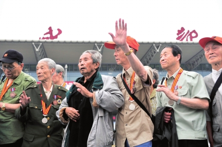 16時許,這批年齡都在80余歲左右的“四川老兵”陸續(xù)來到了報社門口集合。大家的表情顯得有些興奮,雖然是臨時接到接機(jī)的通知,老人們還是精心準(zhǔn)備了一番,每個人都戴上了建川博物館送給他們的紀(jì)念抗日戰(zhàn)爭勝利60周年徽章,82歲的王世雨老人的左胸上,更是戴滿了記錄著他崢嶸軍旅生涯的各式獎?wù)隆?/p>