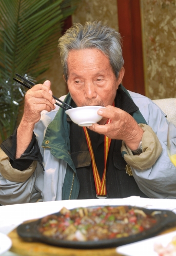 回鍋肉、麻婆豆腐,老人看著桌上地道的川菜有點(diǎn)發(fā)呆,低頭,聞聞。“外公,吃塊回鍋肉。”吃上家鄉(xiāng)的肉,老人一定覺得那肉香似曾相識。“來,我們歡迎老兵回家。”飯桌上,大家共同舉杯祝福,歡迎老人回家。