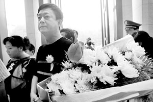 昨天上午11時(shí)許,央視主持人朱軍身著一襲黑衣來到北大百年講堂,在工作人員引導(dǎo)下從快速通道進(jìn)入靈堂。