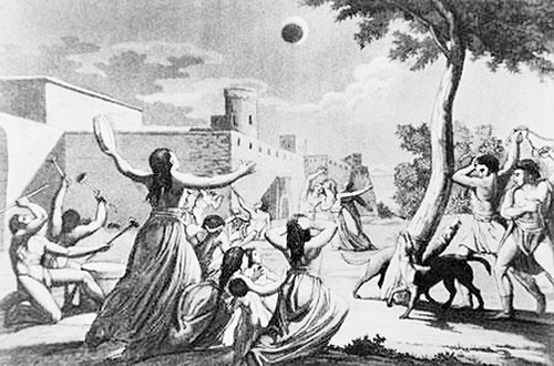 一天,兩軍對陣,激烈的廝殺一直持續(xù)到太陽偏西。忽然,士兵們發(fā)現(xiàn),一個黑影闖入圓圓的日面,把太陽一點點吞食,眩目的太陽光盤逐漸減少,大地的亮度慢慢減弱,好像黃昏提前來到。隨即,太陽全被吞沒,頓時天昏地暗,仿佛夜幕突然降臨,一些亮星在昏暗的天空中閃爍。士兵們從來沒見過這種景象,驚得目瞪口呆,停止了廝殺。