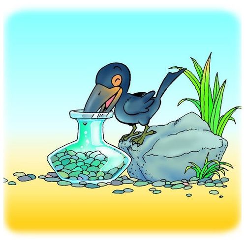 伊索寓言《烏鴉與水瓶》的故事,是講一只烏鴉口渴了,它發現有個瓶子裝了水,但水太少,它的嘴不夠長,伸到瓶子里也喝不到水。它想到一個辦法,就是把一個個小石頭投入瓶中,讓水位上升,直到嘴能喝到水為止。