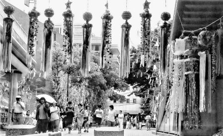 鳥住貞義先生還給我放了一段去年七夕時,枚方市祭掃“七夕神社”的錄像,我看到,前往祭掃的人除了“七夕研究會”的成員外,還有當地的議長、市府官員以及許多民眾。在“七夕神社”的周圍栽了很多竹子,前往祭掃的大人小孩都將自己的心愿寫在一張長紙條上,然后掛在竹子的枝條上,用來祈福。這使我想起日本小鈞市的“七夕文化”,也牽涉到兒童,“七夕”這天早上,凡年滿6歲的兒童在媽媽的陪同下,到野外的莊稼上取些露水回家,然后用露水磨墨寫字。這是一種儀式,代表兒童從這一天起,就開始啟蒙讀書寫字了。據我考證,這是日本和中國“七夕文化”略有不同的地方,其他如七夕夜放河燈,為牛郎與織女照明祝福;一家人在庭院里擺上桌子,沏上香茶,一邊品茶一邊觀看牛郎與織女相會天河的美景;在葡萄架下側耳傾聽牛郎與織女相會時的絮語;姑娘在絲瓜架下默默地向天上‘乞巧’,盼望自己能像織女那般心靈手巧,這些幾乎是相同的。□文/圖 湯禮春