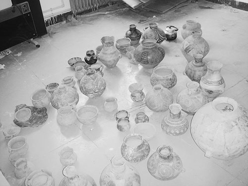 9月5日,記者以文物購買者身份來到“金剛手”家。他拿出幾件彩陶向記者介紹說,這都是從村民手上收來的。這幾件彩陶有一個直徑約10厘米的碗,外沿有條形彩繪。據介紹,這完全是沒有修飾過的出土文物,但由于花紋較普通,所以價錢不太高。還有一個很小巧的三足罐,據介紹這是破損后修補的,所以價錢也不貴。還有一個約10厘米高的小口罐,花紋較精美。“金剛手”承認這是“老貨新工”,即出土時掉色了,花紋是后來畫上去的。