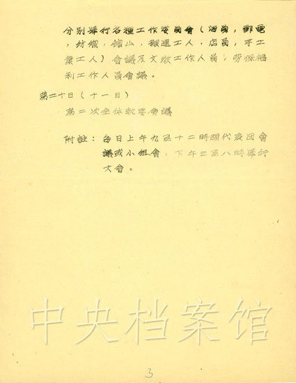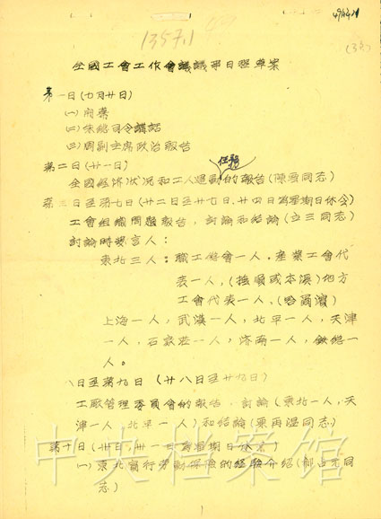 1949年7月23日至8月16日,全國(guó)工會(huì)工作會(huì)議在北平舉行。出席會(huì)議共有省、市、區(qū)72個(gè)單位的代表254名。毛澤東、朱德、周恩來等先后到會(huì)講話,李立三作了關(guān)于工會(huì)組織的報(bào)告。這次會(huì)議規(guī)定了當(dāng)時(shí)全國(guó)工會(huì)工作的中心任務(wù),就是在一年左右基本上把全國(guó)工人階級(jí)組織起來,以便在新中國(guó)的政權(quán)建設(shè)和經(jīng)濟(jì)建設(shè)中勝利地?fù)?dān)負(fù)起領(lǐng)導(dǎo)階級(jí)的歷史使命。會(huì)議通過了《關(guān)于勞資關(guān)系暫行處理辦法》等四個(gè)文件,明確了在新民主主義政權(quán)下處理勞資關(guān)系的正確途徑。
