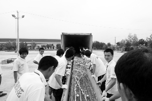 據(jù)趙偉平介紹,3幅網(wǎng)幕焰火巨作,共用了27輛“小火車(chē)”,“小火車(chē)”又分別坐上了5輛重型貨柜車(chē),終于運(yùn)抵了天安門(mén)廣場(chǎng)。(郝濤)