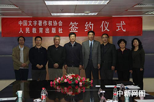 新聞出版總署副署長(zhǎng)、國(guó)家版權(quán)局副局長(zhǎng)閻曉宏,中國(guó)文字著作權(quán)協(xié)會(huì)會(huì)長(zhǎng)、中國(guó)作協(xié)副主席陳建功出席并致辭。中國(guó)文字著作權(quán)協(xié)會(huì)常務(wù)副總干事張洪波與人民教育出版社社長(zhǎng)李志軍代表雙方簽字。
