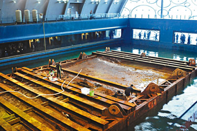 博物館主場南海一號古船所在的沉箱,考古隊員正進行一場水下考古挖掘的動態(tài)演示。經(jīng)過幾天的放水調(diào)試,沉箱的其中兩個探方已微露船舷。據(jù)稱,沉箱仍不會立即打開,這是為了保護古沉船的微環(huán)境。考古人員將采取逐層打開的措施,一點一點地發(fā)掘,同時,也有3名蛙人在水下作業(yè)。