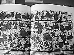 圖四是山東嘉祥出土的漢代畫像石。山東嘉祥的漢代畫像石內容為垓下之戰。畫面分為三層。第一層是項羽問路,老農詒曰向左,結果項羽陷大澤中。第二層是在長堤上,長堤就是垓下,項羽將手下分成四隊,向四方。最下層是烏江亭長駕駛船請項羽上船,項羽背過身,不肯回江東。洛陽曹操墓出現的這塊石頭顯然是正中間的一部分,這種畫不會是孤立的,說明這個石頭是從別處抬來的。