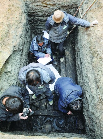 考古人員提取墓葬內的器物。張中攝(圖片來源:齊魯晚報)