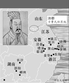 通過對這一百多件族譜的全面查閱、辨別梳理,曹操后裔可能的分布遷移圖逐漸顯現,甚至精確到縣——古曹氏主要在漢時名為沛郡的地方活動,也就是如今江蘇北部、安徽的一部分、河南到山東交界地區。從族譜的反映情況來看,此后曹家發生了很大的遷徙,方向往南走的居多,且主要是分布在長江流域,如浙江的東陽、蕭山、紹興、余姚、金華,江蘇的宜興、鎮江,安徽的涇縣、歙縣、績溪,湖南的郴州、益陽、長沙,甚至包括上海。