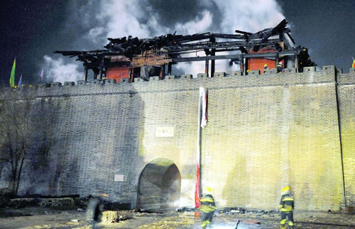 昨日,記者從正定縣文物旅游局獲悉,目前正定南城門上仿古建筑燒毀嚴(yán)重,游客暫不能登城游覽。城門上啟功書寫的“長(zhǎng)樂門”三字匾額已被燒毀。古城磚墻部分并無(wú)大礙,上書“三關(guān)雄鎮(zhèn)”字跡仍在。目前,正定縣已將南城門列入計(jì)劃準(zhǔn)備馬上重修。