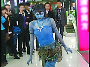 擁擠的中關村電子賣場,一位舞者化身成電影《阿凡達》里的納美人,伴隨著《大河之舞》的音樂正大跳踢踏舞,藍色的腳尖踩踏的不是地板,而是9臺筆記本……這段被市民拍下的視頻在網絡上瘋傳,網友評價其為“史上最具幻想力的商家宣傳”。