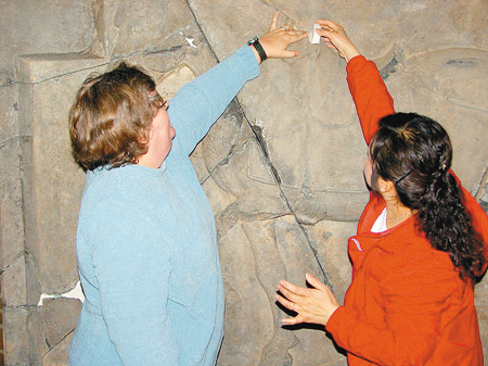 賓大博物館首席文物保護專家格蘭特女士和西安專家劉林西女士在反復比對文物殘塊模型。