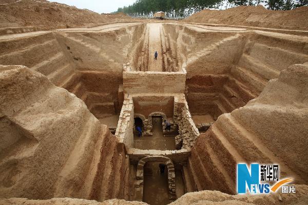 30日上午,記者在現場看到2000多平方米的玻璃鋼瓦防護棚已經搭建完畢,同時還用沙袋在墓葬周圍筑起了一道防水墻,防止雨水流入墓葬毀壞發掘現場,支撐防護棚的鋼管腳手架同四周墓壁也保持了一定距離,底部還墊有木板,避免腳手架同墓室地面直接接觸而造成破壞。