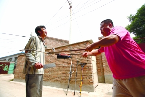 吸刀器、鎖喉器、捕捉器、自救器,昨日,北京八中的萬(wàn)能工(什么活都能干的工人)齊海軍在通州古城村的自家門前,演示起他發(fā)明的校園安保“四件套”。