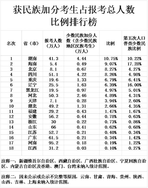 除此之外還有北京。北京今年獲加分的人數(shù)近1.1萬人,占全部考生8.1萬人的1/8強。即使減去少數(shù)民族考生6700余人,仍有4000余人獲得加分。