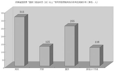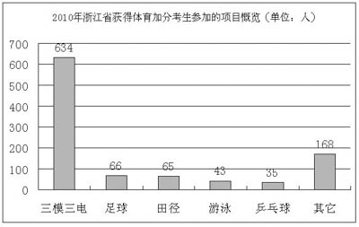 統(tǒng)計還發(fā)現(xiàn),田徑、籃球、足球三項加分考生在各地市分布比較平均,而健美操、無線電測向和定向越野卻集中在成都、綿陽和南充3市,共為500人,占這三項加分總?cè)藬?shù)的78%。