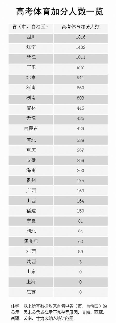 很多省份對體育加分項目并沒有做出詳細說明,如福建、吉林,只標明了“經省教育廳、體育局認定的國家二級以上運動員”;天津、新疆也未明晰具體體育項目。貴州和河南也只是簡單地區分了“重大體育比賽”及“國家二級運動員(含)以上”。 實習生 周薇