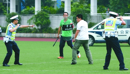 15時(shí)07分,一輛警車開進(jìn)操場(chǎng),8名全副武裝的飛龍突擊隊(duì)員跳下車門,迅速包圍操場(chǎng)中央圓弧。他們身穿多功能戰(zhàn)術(shù)背心,頭戴防彈頭盔,手握沖鋒槍,大腿外側(cè)還佩戴著手槍。“放下兇器”,一名突擊隊(duì)員通過擴(kuò)音設(shè)備兩次喊話,但兩名持刀男子拒不就擒。
