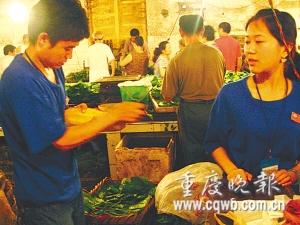 “愣在那兒干啥?吆喝幾句噻!”昨早7時30分,在模范村農貿市場一菜攤,19歲的大一新生盛強,拿著一捆小白菜,對身旁發呆的同學劉芳說。盯著眼前一堆蔬菜看了老半天的劉芳,終于吆喝起來。