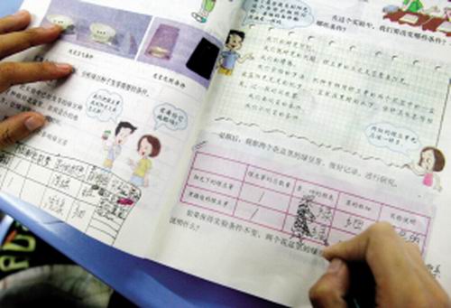 參與調(diào)查的同學(xué)韓迪聰介紹說,調(diào)查發(fā)現(xiàn)同學(xué)們在循環(huán)使用教科書時(shí),因?yàn)椴荒茉谏厦鎸懽痔羁樟,就需要?zhǔn)備一個(gè)本子,抄寫教科書上需要填寫的內(nèi)容。比如說《科學(xué)》,里面就有一些實(shí)驗(yàn)報(bào)告,同學(xué)們或者把報(bào)告填寫部分抄下來,或者是自己復(fù)印,要不就是只聽課,不做題了。