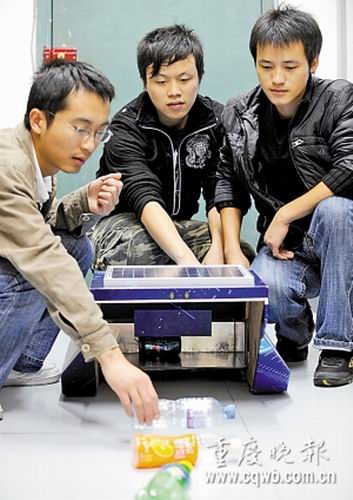 “我們發明的機器人會撿礦泉水瓶和塑料袋,還會掃地……我們將把它作為畢業紀念品送給學校。”昨日(10月29日),重慶交通大學機電與汽車工程學院的大四學生胡偉平、謝敬濤、王定坤等五位同學將發明的“保潔機器人”贈送學校,作為回報母校的禮物。